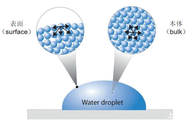 但是,表面的出现,使得一些分子变得不同,它们的外侧是气体或真空,几乎没有作用力,这使得表面上的分子“很不安分”,产生了额外的能量——表面能。