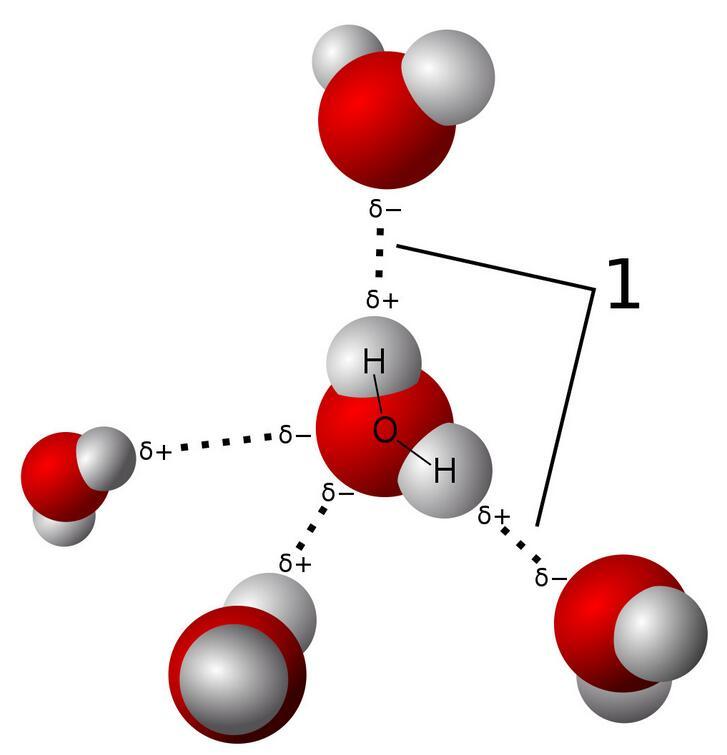水由氢和氧原子组成。当氢(H)原子与氧(O)、氮(N)或氟(F)结合时,氢唯一的一个电子会与它们形成共价键,这时候氢原子的电子由于被O、N或F吸引而稍稍“跑偏”,导致氢原子这一端呈现更多的正电性(氢原子核带正电);与之相对应地,分子的另一端会因为吸引电子的能力更强而显示出负电。分子对外显示出比较强的电极性,分子与分子之间会因为电极性的不同而相互吸引。