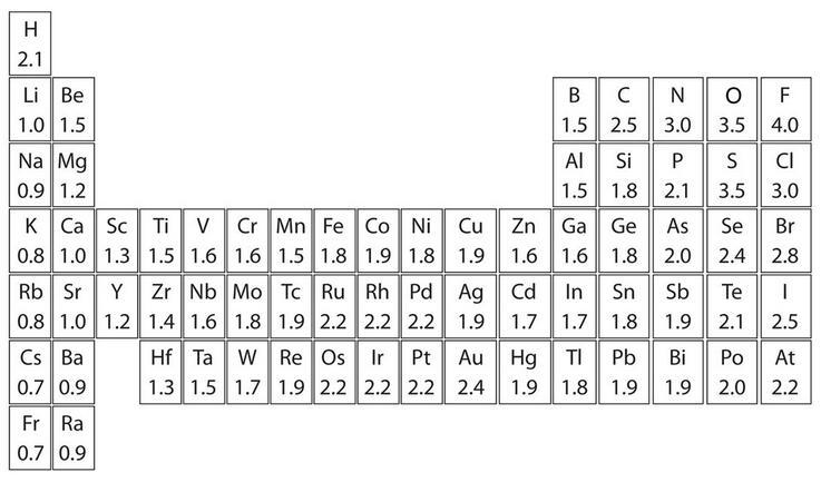 上图是元素周期表中部分元素电负性的标量,电负性是一个无单位数,数字越高,原子吸引电子的能力越强。蜜桃性爱视频网站可以通过确定参与共价键的两个原子的电负性的差异来判断共价键的极性: