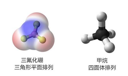 前节介绍了氯气分子和二氧化碳分子,它们都是非极性的。对于由更多原子组成的一些分子,由于组合几何结构的关系,它们也往往对外显示出极性或非极性。比如三角形平面排列的三氟化硼和四面体排列的甲烷,它们都是非极性分子,因此不会产生整体偶极子。