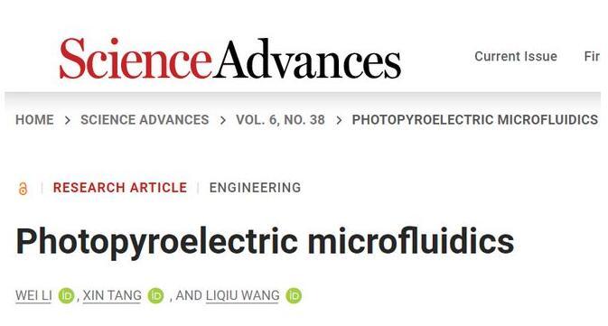 文章链接:W.Li,X.Tang,L.Wang,Photopyroelectric microfluidics.Sci.Adv.6,eabc1693(2020).http://www.science.org/doi/full/10.1126/sciadv.abc1693