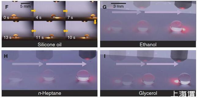 光电微流控平台的设计:微流控平台包括底层的光热薄膜(石墨烯掺杂的PDMS),中间层的热释电晶体(LiNbO3)和上层的超疏液涂层(SiO2纳米空心球分形网络)(图1)。光束可以穿过上层透明的超疏液涂层和热释电晶体照射到底面的光热薄膜,光热薄膜将光能转换成热能使自身温度升高,从而加热上方的热释电晶体在光束照射处产生表面电荷,当电荷引起的介电泳力足以克服液滴在超疏液涂层上的粘附力,液滴则被吸引至光束下方。超疏液涂层不仅为液滴移动创造了极低的阻力,而且避免了液体残留,使得无损液滴操控成为可能,可以对包括硅油、乙醇、正庚烷和甘油在内的30多种液体(表面张力18.9-98.0mN/m)进行无损光控操作。