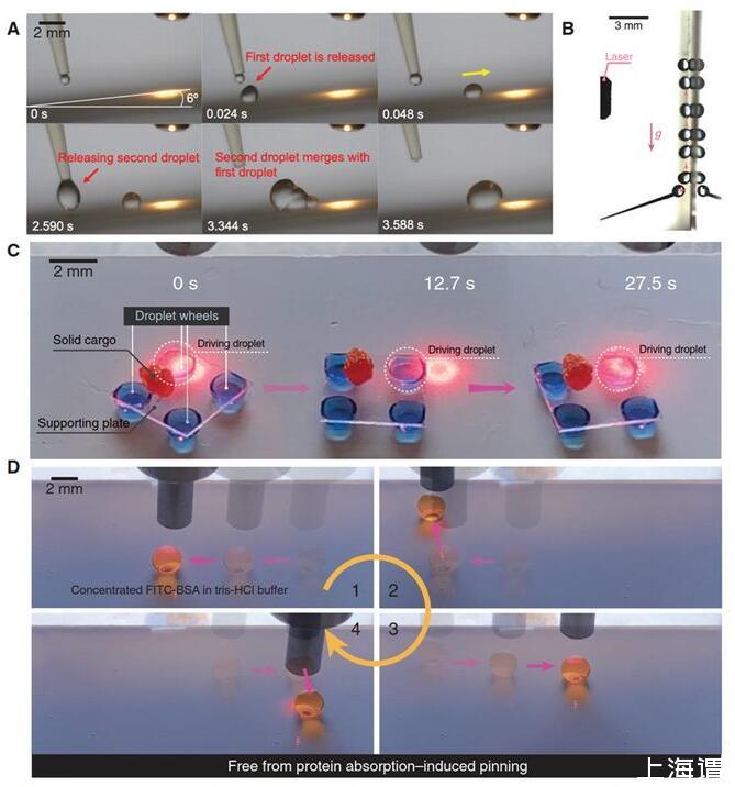 图3.多样化应用。(A)液滴爬坡,(B)液滴反重力垂直爬壁,(C)光控软体机器人,(D)避免蛋白质残留,(E)氨基酸检测.