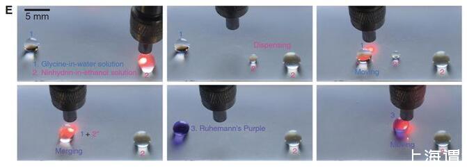四项基本操作:光电微流控平台产生的波浪形的介电泳力场可以对液滴执行包括移动、分裂、融合和分配在内的四种基本操作(图2)。移动:可以指引表面张力18.9~98.0mN/m、体积1nL~1000uL的任意液滴以任意方向进行无限距离的运动,瞬时速度高达150mm/s,连续移动速度可达50mm/s。融合:处于不同位置的多个液滴,可由单束光吸引至光束下方,多个液滴即可相互融合在一起。分裂:当液滴处于光束正下方时,液滴受到两个大小一致、方向相反的介电泳力,当两个力的作用足以克服液体的表面张力,液滴即被撕裂成两个独立的小液滴。分配:当液滴处于光斑边缘时,液滴受到两个不对等的作用力,一个子液滴即被从母液滴中溅射出来,而母液滴仍被限制在光斑边缘,从而可以连续进行分配操作。