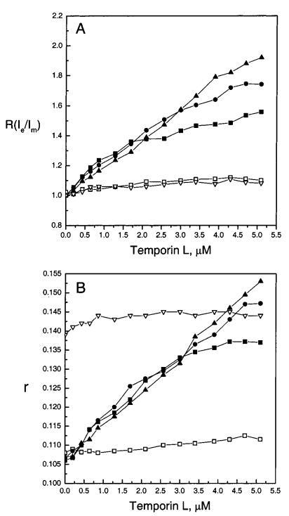 图5:通过芘标记的磷脂PPDPC(X)0.01)的荧光和DPH(X)0.002的稳态发射各向异性r评估颞叶素L对LUV中脂质动力学的影响,显示为含XPOPG)0(0)、0.10(9)、0.20(B)和0.40(2)的SOPC脂质体中归一化准分子与单体比率r(Ie/Im)(图A)和各向异性r(图B)的变化,Xchol)0.10(3)。每个数据点代表三次测量的平均值。标准偏差小于0.02(面板A)和0.004(面板B),为清楚起见,未显示。否则情况如图2图例所示。
