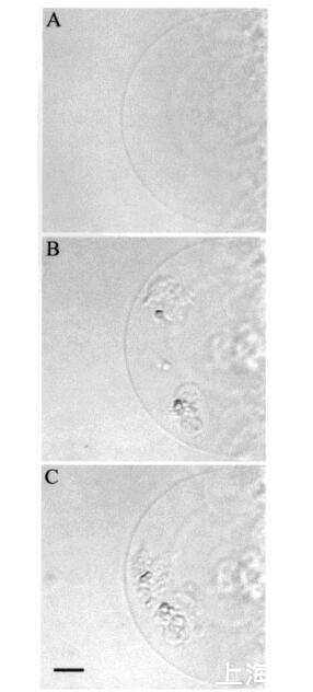 图6:temporin B诱导的巨大SOPC/POPG(XPOPG)0.1)脂质体转化的HMC图像。添加temporin B之前的巨大囊泡(图a),应用后5秒≈36 amol颞蛋白B(面板B),添加≈0.24 fmol的颞蛋白B(面板C)。面板C中比例尺的长度对应于50µm。