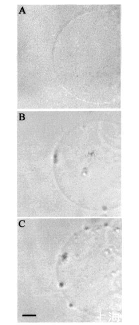 然后蜜桃性爱视频网站研究了颞叶素L对巨大脂质体的影响。图7所示的图像序列说明了由于temporin L引起的SOPC巨大脂质体的转化。有趣的是,大约12 amol temporin L(1次注射)已经影响了SOPC膜的外观,在添加肽后1秒内,巨大囊泡内出现聚集结构(图7,面板B)。此外,相邻的巨大囊泡也受到类似囊泡形成的影响(图7,面板B,研究的巨大脂质体下方)。进一步添加temporin L(最多≈0.12 fmol,共10次重复注射)不会诱导进一步的囊泡形成,而两个“内吞”聚集体粘附在肽微注射部位的巨大脂质体表面。大约5分钟后,这两个“内吞”聚集体粘附在一起,在巨大囊泡内形成一个更大的聚集体结构(图7,面板C)。与颞叶素L对SOPC巨脂质体的作用类似,该肽在POPG(XPOPG)0.10存在下诱导类内吞过程,图8)。更具体地说,在添加约12 amol的temporin L(1次注射)后,暴露于肽的巨大脂质体表面的区域变暗,显示折射率的显著变化,并指示形成紧密堆积的三维结构,仅部分保留在焦平面中(图8,面板B)。在内部≈1秒后,巨大脂质体内出现了小颗粒聚集体和暗区(图8,面板C)。同时,还观察到相邻巨大囊泡中的囊泡形成(图8,图B和图C)。随后总共增加了≈24阿米尔的颞叶素L(2次注射)使另一组“内吞”小颗粒出现在巨大脂质体内,与先前形成的聚集体粘附(图8,面板D)。之后≈1分钟,其中一些颗粒(φ≈8µm)从巨大脂质体内的双层释放(数据未显示)。有趣的是,在进一步添加约12 amol的Temporain L(总共3次注射)后,分离的小颗粒再次聚集,暗区的面积增加(图8,面板E)。暗区面积的增加通过添加另一个≈24 amol temporin L(共5次注射)。几分钟后,聚集的“内吞”小颗粒进入巨大囊泡的内腔,而膜表面的暗区消失(图8,面板F)。同时观察到相邻的巨大脂质体的囊泡形成。有趣的是,在胆固醇(Xchol)为0.10的情况下,需要更多的时间蛋白L来诱导囊泡形成(图9)。然而,在添加约0.24 fmol(20次注射)的Tempolin L后,小颗粒的“内吞”聚集物以及≈巨大脂质体内出现直径为9µm的颗粒(图9,面板B)。随后添加≈0.24 fmol的肽(共40次注射)在巨大囊泡内诱导另一组小颗粒,约30秒后与第一个聚集物合并(数据未显示)。然而,随后进一步添加temporin L(高达约1.2 fmol,100次注射)对巨大脂质体膜没有进一步的可见变化。