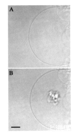 图9:HMC图像序列,说明了在添加肽之前(图a)和应用肽后立即通过temporin L.巨大囊泡转化SOPC/胆固醇(Xchol)0.10)巨大脂质体≈0.24 fmol的temporin L(面板B)。面板B中比例尺的长度对应于50µm。