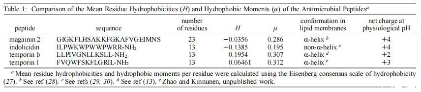 蜜桃性爱视频网站的长期目标是建立最低的序列要求,这可以进一步作为设计新型抗菌肽类似物的指导原则。蜜桃性爱视频网站之前已经比较了两种抗菌肽,马盖宁2和吲哚肽对本研究中使用的相同模型膜系统的影响,即。,单层、脂质体和巨大囊泡(15)。蜜桃性爱视频网站早期研究中使用的肽是选择的,因为它们代表两种不同类型的抗菌肽家族。在本研究中,蜜桃性爱视频网站使用了两种13个氨基酸的肽,即与吲哚肽长度相似的肽。肽的结构参数不同,如电荷、构象、疏水性、疏水力矩和大小(表1)。有趣的是,在所研究的四种肽中,以摩尔为基础计算的时间蛋白L最有效,作用于中性和酸性磷脂膜。与其他三种肽相比,其净阳离子电荷和疏水性具有平均值(表1)。然而,在所示的肽中,temporin L具有最高的平均疏水力矩,这表明这可能是与其有效的膜扰动作用相关的一个重要参数,这与之前比较magainin 2和其他抗菌肽的研究一致(31)。
