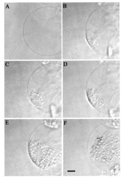 图8:HMC图像,描绘了应用temporin L之前以及添加temporin L后立即(面板B)、1秒(面板C)由temporin L.巨大囊泡诱导的巨大SOPC/POPG(XPOPG)0.1)脂质体的转化≈12 amol Temporain L,并在添加后立即(面板D)≈24 amol的颞叶素L。在注射了总计≈36 amol(E组)的temporin L,以及在添加总计≈60 amol temporin L。面板F中比例尺的长度对应于50µm。