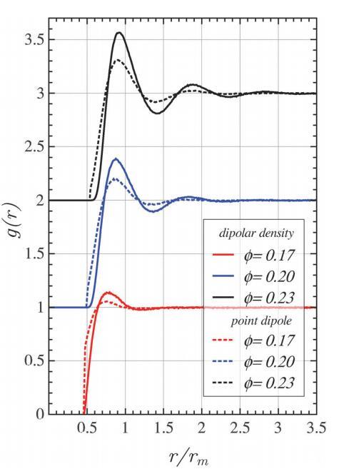 在第一个峰值位置和g(r)开始偏离零的小区域观察到轻微差异。当系统更加结构化时,协议会得到改善。特别是,对于弱相互作用域,差异开始明显。这些偏差是由于点偶极力在接触时趋于有限值,而在偶极密度情况下,它会发散。因此,硬盘相互作用与点偶极子模型有关。