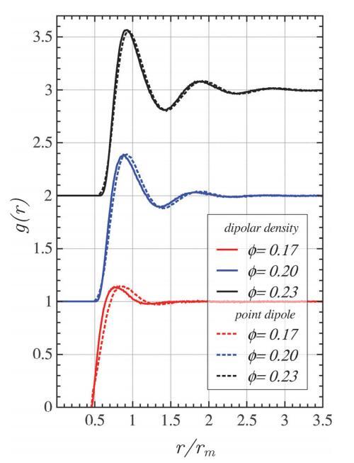 图8使用偶极密度和点偶极相互作用从BD模拟中获得的径向分布函数。对于每个面积分数,两种模型的f0值相同,如表2所示。为了清晰起见,数据已垂直移动。