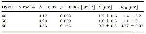 表1考虑的单分子膜的凝聚面积分数、数密度、平均半径和有效半径。误差由标准差确定,但f除外,f是通过改变阈值确定的,如实验部分所述