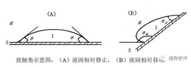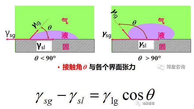 由杨氏方程,θ由γsg,γsl,γlg决定。对于指定的固体,液体表面张力越小,其在该固体上的θ也越小。对于同一液体,固体表面能越大,θ越小。