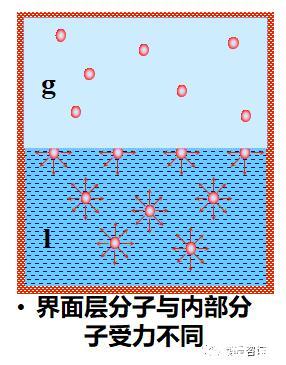 (一)、处于液体体相内的任一分子受到其周围四面八方分子的作用是相等的,可以抵消,故在液体内部分子的移动无需做功。处于液体表面上的分子受到液体内部分子的作用力远大于另一侧气体(或蒸气)分子的作用力,因而液体表面分子有自动向液体内部迁移的趋势,这种趋势的表现之一是液体表面自动缩小,表现之二为欲扩大表面需外界做功。