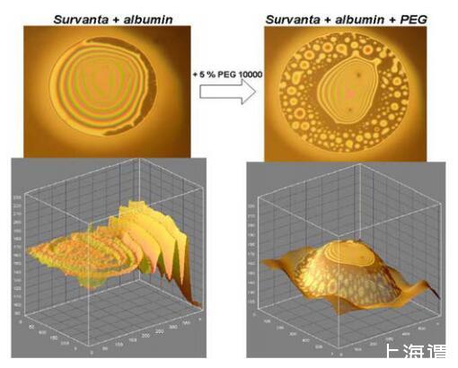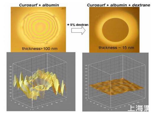 当通过Survanta和白蛋白添加到混合FFs中时,葡聚糖不会改变膜的性质。然而,当FFs中包含PEG 10000时,富含白蛋白的厚膜分解成更小的厚“岛”,岛之间有薄的(h=17 nm)黑色区域(图4)
