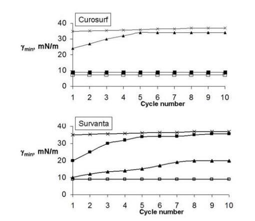 图1.Curosurf(上图)和Survanta(下图)单层的最小表面张力(γmin)对压缩/减压循环次数的依赖性。符号表示:□-纯空气/水界面处的ESP(盐水溶液亚相上);在BSA亚相上的x-ESPs(2mg/ml);■-在BSA(2mg/ml)和5%葡聚糖的亚相上进行ESPs;▲-在BSA亚相(2mg/ml)和5%PEG 10000上进行ESP。ESP作为脂质体悬浮液扩散,最终浓度为15μg磷脂/ml。实验在0.15 M NaCl、pH 6.8-7.0、T=25℃下进行。