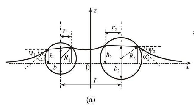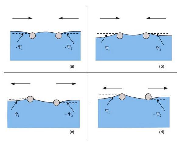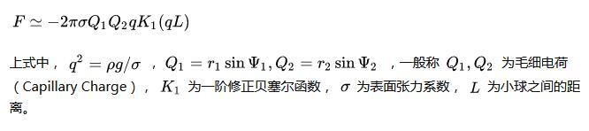 从能量的角度来看,液体表面能并不是由独立放置单个小球时液面表面能的简单相加,还要加上一项因另外一个小球存在时的相互表面能,其与小球之间的距离直接相关。这种相互表面能表现为沿小球连线方向的横向毛细力。