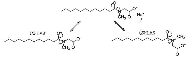 Bordes等人研究了氢键对甘氨酸盐和肌氨酸盐自组装的影响[17]。Gad等人研究了具有不同碳链长度的N-酰基肌氨酸盐的界面张力[3]。还对含有SLA的二元混合物与Gemini表面活性剂[18]和阳离子聚合物[19]进行了一些界面研究。然而,这些研究没有考虑它们的pH影响。Tsubone等人在pH值为10.5[20]时对SLA进行了界面张力测量。然而,SLAS水溶液的界面张力在很大程度上取决于pH,在胶束前和胶束后区域中,当pH小于约7时,其值显着下降。cmc和C20在较低pH下也会降低,但cmc/C20比在pH<7.3时增加。该比值的增加通常意味着亲水头的尺寸增加和/或与反阳离子的缔合增加。在pH<7.3时,Γmax也急剧增加。这些结果清楚地表明,在空气-水界面的较低pH区域,SLA的Na+阳离子被H+取代。向溶液中加入Tl+,证实LAS的界面张力−并且它们以H+<Na+的顺序增加,这与这些结果一致。此外,蜜桃性爱视频网站使用1H-NMR和13CNMR研究了D2O和CD3OD中HLA和SLA的结构差异。根据这些结果,例如,来自LAS亲水部分中1小时的所有信号−可以想象,HLA和SLA都具有共振结构,(Z)-LAS−和(E)-LAS−,如图9所示。通过NMR[21,22]的胶束化也报告了这些SLAS异构体的存在。根据分裂峰的积分比,Z/E形式的丰度比确定为SLA为1:1,HLA为2:1。由于E型比Z型体积大,这可能是Γmax随pH值增加而减小的第二个原因,直到pH值为7.3。另一方面,除了RB的各向异性(在pH<7时明显增加)外,含水体中的胶束性质对pH的依赖性小于界面性质。然而,在pH值降低时,聚集数和流体动力学半径的小幅度增加趋势以及胶束核的微极性的减小趋势可以很好地解释为LAS亲水性头基团之间的静电力减小−由Na+到H+的反阳离子置换引起,与界面性质的情况相同。虽然蜜桃性爱视频网站尚未确定界面和胶束中HLA的pKa值,但这些值应大于水溶液中的pKa值(pKa,bulk=3.3);界面处的值可能略大于胶束中的值。pH<7时体积较小的Z型的增加也与胶束性质相容,并可能与胶束亲水部分附近RB各向异性的增加直接相关。