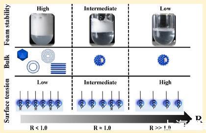 研究了基于肉豆蔻酸和氢氧化胆碱混合物的模型体系的界面和泡沫性质,作为这两种组分之间的摩尔比(R)和温度的函数。本研究的目的是了解本体和泡沫液体通道中的自组装、界面处的表面活性剂填充以及由此产生的泡沫性能和稳定性之间的联系。采用多尺度方法,结合小角度中子散射、镜面中子反射率、表面张力测量和摄影。蜜桃性爱视频网站通过修改R强调了该系统中泡沫稳定性的三种状态:R<1时的高泡沫稳定性,R时的中间稳定性∼1,R>1时较低。不同的状态来自于与R相连的本体中的pH变化。pH通过设置吸附在气体中的肉豆蔻酸分子的电离状态在分子尺度上起着至关重要的作用−这又控制了单层的性质和分离气泡的膜的稳定性。获得稳定泡沫的主要要求是将pH设置为接近pKa,以使质子化和电离分子的混合物产生分子间氢键。结果,在界面处形成具有低表面张力的致密单层。R还改变了自组装体的结构,因此也改变了泡沫内的自组装结构,但这种形态变化对泡沫稳定性的影响很小。该研究证实,以羧酸为极性头基的表面活性剂体系中的泡沫稳定性主要与界面处分子的电离状态有关。