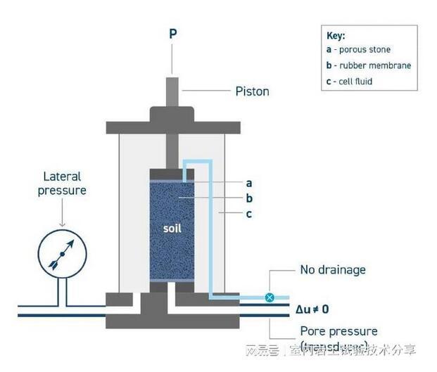 这里以有效应力来衡量剪切强度。试样饱和并允许在所需的约束压力下进行固结(土壤固结是改变其结构和含水量的过程)。一旦固结,试样就被施加了一定的荷载,在此期间不允许排水,以便测量孔隙压力。