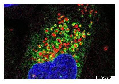 荧光显微图像显示了内质网(绿色)像毯子一样包裹住受损的溶酶体(红色),细胞核以蓝色显示。