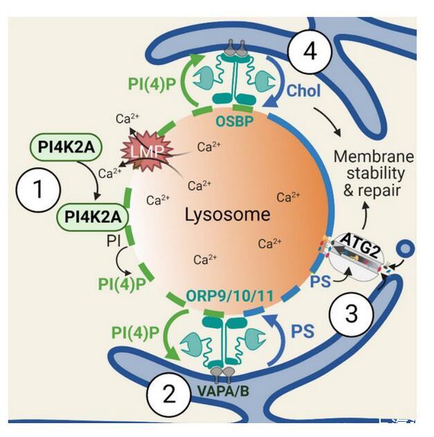 PI4P信号触发了“警报系统”,有选择性地对受损溶酶体进行标记。这将进一步招募ORP家族蛋白(包括ORP9/10/11和OSBP)——它们一端结合受损溶酶体上的PI4P,另一端结合在内质网上。内质网是细胞中最大的膜结构细胞器,负责脂质与蛋白质的合成。在ORP家族蛋白的帮助下,内质网与受损溶酶体紧密地结合起来。