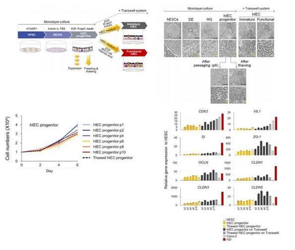 鉴于此,韩国生命工学研究院的一项研究开发了一种重复性良好的两步方法来诱导人多能干细胞分化为可扩大的hIEC祖细胞和具有功能性的hIEC单层细胞。