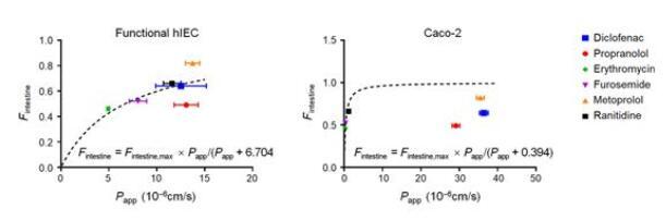 图3|6种临床模型药物在功能性hIECs与Caco-2模型上吸收的拟合结果