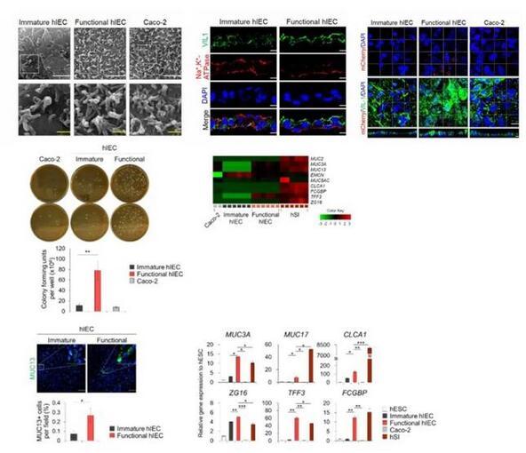 由于在hSI中,Wnt的抑制和Notch的激活有助于祖细胞分化为吸收前上皮细胞,研究者使用了Wnt信号抑制剂Wnt-c59和Notch信号激动剂丙戊酸(VPA),来进一步将hIEC祖细胞分化为与体内类似的成熟且有功能的hIEC。与其他仅由吸收性肠细胞组成的小肠上皮模型相比,该系统可以模拟体内样肠组织进行研究。与未成熟的hIECs相比,功能性hIECs形成了一个结构极化的单层,并观察到了类似杯状细胞分泌出的粘液。此外,功能性单分子层hIEC的顶表面接触的细菌数量明显更高,并且黏液蛋白和黏液蛋白相关基因的表达在功能性hIEC中显著增加能够允许肠道微生物群的持续定植。