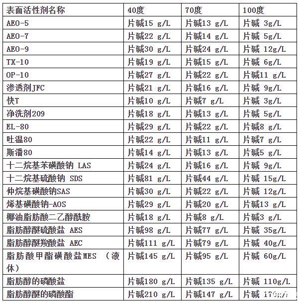 测试方法:取10g/L的表面面活性剂,加入片碱,在规定的温度放置120分钟后,观察,出现分层或漂油时的碱用量即为最大耐碱量。