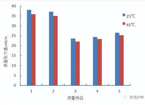 采用铂金环法,分别在25℃和45℃的温度下测量五种油墨的表面张力值。