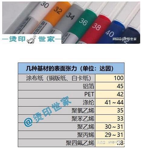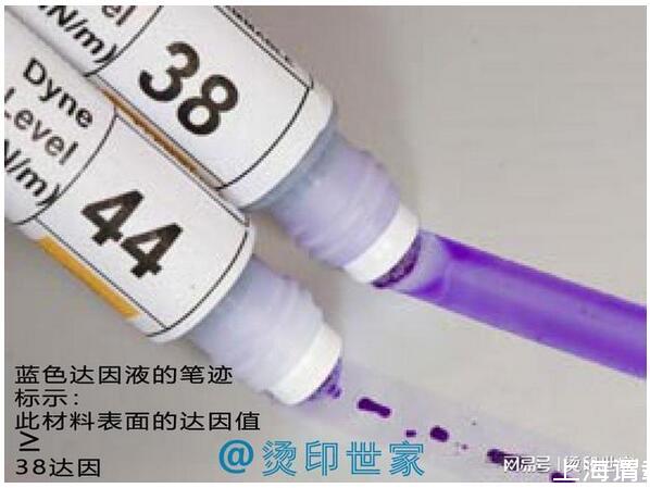 对于烫金而言,一般承印基材表面的张力应不低于38达因,达到或超过40被认为是理想的,这样的表面才能获得满意的烫印效果。如果达因水平低于38,则电化铝不会正常转移。所以烫印机台应常备36、38、40三种规格的达因笔。