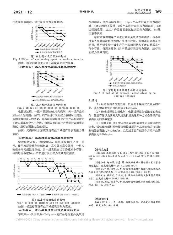 摘要:钕铁硼永磁材料表面镀覆光亮镍铜镍,可以很好的增加钕铁硼永磁材料的耐腐蚀性;但与此同时对镀覆光亮镍铜镍的钕铁硼永磁材料进行装配使用的过程大多会采用粘接的固定方式,由于其镀层特性,表面会比较"滑",为了保证其固定效果,就需要对其表面张力进行管控。通过控制变量法研究确认镍铜镍镀层表面张力的影响因素(干燥方式、粗化剂浓度、光亮剂浓度、存储温度、是否表明特殊清洗),最终提高镍铜镍镀层的表面张力,初始表面张力≥42dyn/cm,存储四个月后≥36dyn/cm,对后续有张力要求的镍铜镍镀层钕铁硼永磁材料产品形成一套有效的管控方法。