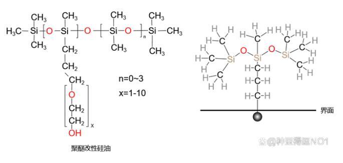 水性体系使用较多的有机硅润湿剂一般为聚醚改性硅油,相对分子质量较小,n=0~3,x=1~10。同时大量的CH3链对外伸展,极大的降低表面张力,研究表明当亲水基在链段中部位置时,效果最好。聚醚改性有机硅的分子结构式和机理如上图所示。
