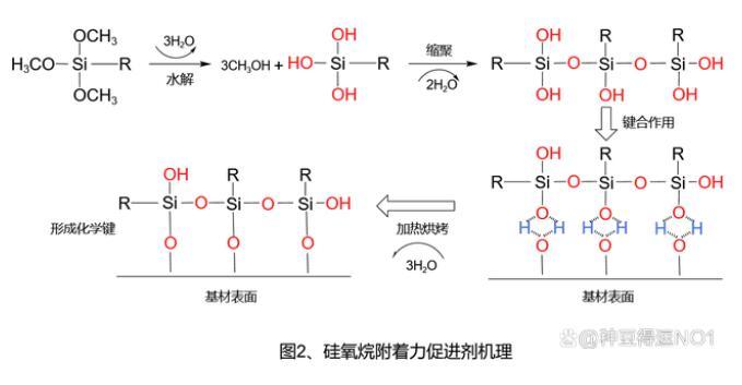 对于陶瓷、玻璃、塑料、金属等基材,通过化学键合的作用能很好的促进涂层与基材之间的附着力,有机硅烷通过水解,形成的硅羟基能与基材表面的羟基,通过键合作用能很好的形成牢固的吸附层,同时R中的活性基团可以与树脂中的基团形成交联反应,从而在树脂与基材之间形成架桥的作用。