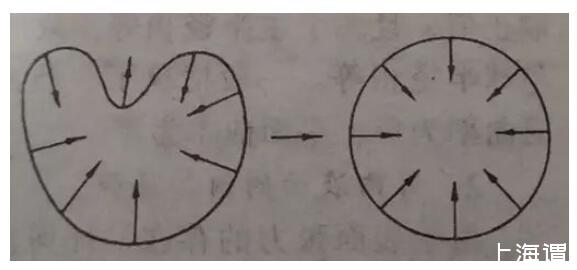 当你吹泡泡的时候,无论用什么泡泡圈,吹出来的泡泡都是近球形的,童鞋们会懊恼为什么:不能吹个泡泡都是爱你的形状呢?从受力分析而言,当泡泡为不规则形状时,其相邻的两点曲率不一样,则表面张力方向不一样,根据受力分析,水会向合力的方向流动,最后平衡状态为相邻两点受力一致,曲率一致。推广到整体,就是一整个球体形状的形成。