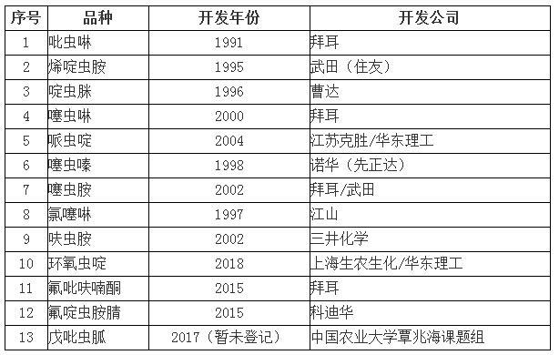 目前,在全球范围内开发或已使用的新烟碱类农药主要有13种,详细信息见表1。