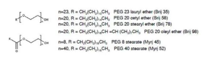 如果将不同分子量的聚乙二醇单链与简单的脂肪烷基长链连接,就获得聚乙二醇烷基醚(Polyoxyethylene Alkyl Ethers),包括月桂醚烷基、油醇醚烷基、硬脂醇烷基、十六烷基等,在制剂中可作为乳化剂、增溶剂和润湿剂等。