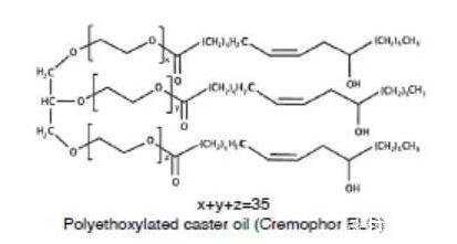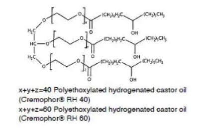 另一类重要的非离子表面活性剂是聚氧乙烯蓖麻油(Cremophor)或聚氧乙烯氢化蓖麻油(Cremophor RH)。蓖麻油是蓖麻油甘油三脂,与环氧乙烯反应,亲水性的氧化乙烯结构便插入到蓖麻酸和甘油之间,便得到了聚氧乙烯蓖麻油,如果蓖麻油中的双键加氢饱和后,再与环氧乙烯反应,那么得到的便是聚氧乙烯氢化蓖麻油。环氧乙烯和蓖麻油的反应位点是随机的,因此得到的表面活性剂是一种混合物,也包括未反应的蓖麻油和均聚形成的聚氧乙烯。不同种类的聚氧乙烯蓖麻油或聚氧乙烯氢化蓖麻油是通过参与反应的氧化乙烯和蓖麻油或氢化蓖麻油的比例决定的,例如Cremophor EL 40或Cremophor RH 40,其中40代表的便是混合物中氧化乙烯和蓖麻油的摩尔比。这类表面活性剂的HLB一般在12以上,常用作难溶性药物的增溶。