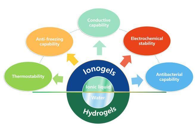 图1.离子凝胶相比于水凝胶的特殊性能