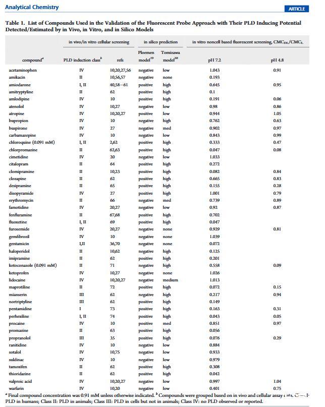 作为截止值0.75,大多数化合物在体内和体外数据之间表现出一致的排名,除了两个:华法林和氨氯地平。据报道,华法林20和氨氯地平10体内PLD较低或没有,但在该荧光测定中观察到CMC变化。