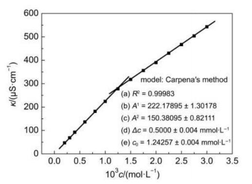 测量原理:利用电导率测定仪测量不同浓度表面活性剂水溶液的电导值(也可换算成摩尔电导率)。对于离子型表面活性剂,当溶液浓度很稀时,电导的变化规律与一般强电解质相似,表面活性剂完全解离为离子,随着浓度上升,电导率K近乎线性上升但当溶液浓度达到临界胶束浓度时,随着胶束的形成,胶束定向移动速率减缓,K仍随着浓度增大而上升,但变化幅度变小。摩尔电导率λm也急剧下降,利用K-C曲线的转折点求CMC值(图4所示)。