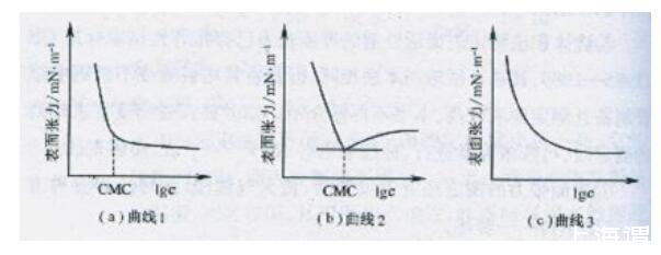 测量原理:溶液的表面张力主要取决于溶液中表面活性剂单体的浓度。当有胶束形成后,单体的浓度几乎不变,所以表面张力对浓度作图会出现明显的转折。一般都是浓度取对数坐标,所得曲线成为γ-logγ曲线,曲线上的拐点即可求出CMC,如果拐点不明显,可将拐点两边的直线部分延长,由交点求出CMC。(图3)表面活性剂水溶液的表面张力在浓度很低的时候随着浓度的增加而急剧下降,到达一定浓度后(CMC)后变化缓慢或不再改变。