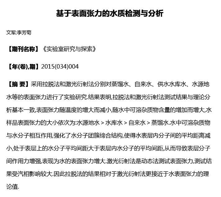 【摘要】:采用拉脱法和激光衍射法分别对蒸馏水、自来水、供水水库水、水源地水等的表面张力进行了实验研究。结果表明,拉脱法和激光衍射法测试结果与理论分析基本一致,表面张力随温度的增大而减小,随水中可溶杂质物含量的增加而增大,水样品表面张力的大小依次为:水源地水水库水自来水蒸馏水。水中可溶杂质物与水分子相互作用,强化了水分子团簇缔合结构,使得水表层内分子间的平均距离减小,处于表层上的水分子平均间距大于表层内水分子的平均间距,从而导致表层分子间作用力增强,表现为水的表面张力增大。激光衍射法是动态法测试表面张力,测试结果受汽相影响较大。因此拉脱法的结果相对于激光衍射法更接近于水表面张力的理论值。