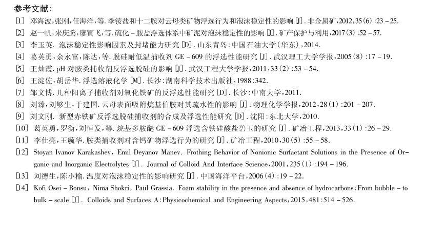 【摘要】:研究了不同pH和浓度对四种阳离子捕收剂表面张力以及起泡性能的影响.通过控制单因素变量,结合表面张力以及临界胶束浓度的相关理论,采用KRUSS蜜桃AV免费观看等设备研究了阳离子捕收剂的表面张力与起泡能力、泡沫稳定性之间的关系。结果表明,pH值对十二胺、N-十二烷基乙二胺两种捕收剂的表面张力影响较明显,对GE-609(醚胺化合物)及十二烷基三甲基氯化铵的影响较小;浓度对四种捕收剂的表面张力及泡沫稳定性都存在一定的影响,但影响程度不同,对起泡能力的影响不明显,但总体呈上升趋势。捕收剂的泡沫稳定性与表面张力存在一定关系,当浓度小于临界胶束浓度时,表面张力越大,泡沫稳定性越弱,起泡能力随浓度的变化存在一定波动,但变化趋势与表面张力没有直接的对应关系。