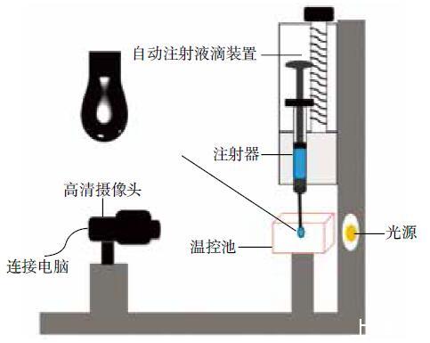 悬滴法是利用滴外形测定表面张力的一种方法,基于数字成像技术,是一种现代的完全数字、计算机化的方法,是一种绝对的测量方法[13,14,15]。该种方法简单、直观、误差小,往往只需准确校正图像放大比例,且可同时评估静态表面张力及动态表面张力。