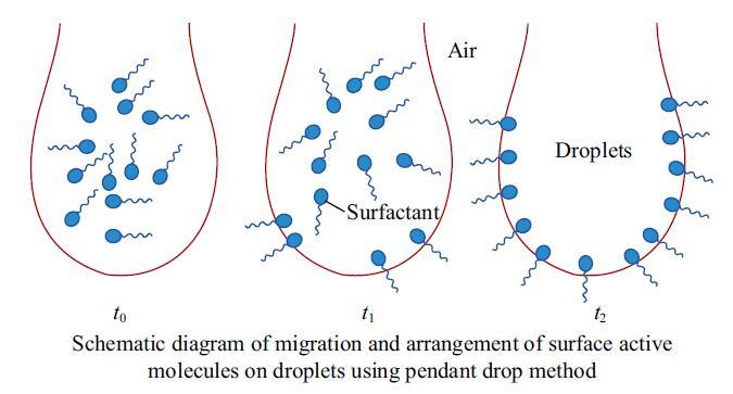 结果表明,在动态表面张力曲线图中,A,B,C三种样品在60 mg/kg的较低含量下,表面张力均呈现先快速降低而后缓慢降低最终达到平衡的趋势,表明表面活性剂分子在液滴表面上确实存在着随时间变化逐渐吸附平衡,排列完整的现象,如图4所示,表面活性剂分子在表面完全吸附、排列紧密需要一定的时间,显然在使用悬滴法进行测定时,时间效应直接影响着表面张力测定的误差大小,符合前文所述结论。而样品B在100 mg/kg含量下,动态表面张力趋势图成一条直线,证明该种表面活性剂在液滴表面迁移速度较快,在液滴完全注射形成之前已快速到达平衡状态,表面活性剂分子在表面得以充分排布,这解释了较低含量的表面活性剂溶液的静态表面张力与国标推荐方法吻合程度差异较大的原因。这是由表面活性剂分子自身性质所决定的,与其极性基的类型、结构、个数、疏水基长度等息息相关。而单一液体,未具有含量差,故不存在表面活性剂分子从溶剂内部迁移吸附至表面这一过程,所以其动态表面张力曲线呈现为平稳直线。