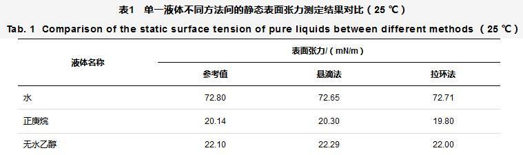 表1单一液体不同方法间的静态表面张力测定结果对比(25℃)