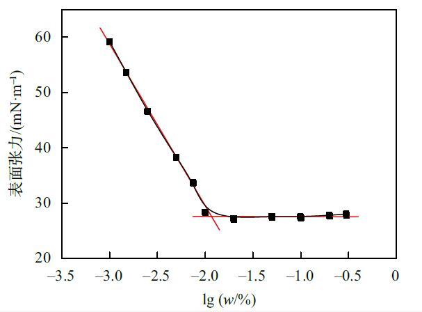 选择阴离子-非离子表面活性剂复配体系,以十二烷基硫酸钠(SDS)和烷基糖苷(APG)复配组分作为实验对象,质量比为1:1。实验结果见表2。试样的表面张力曲线图如图2所示。